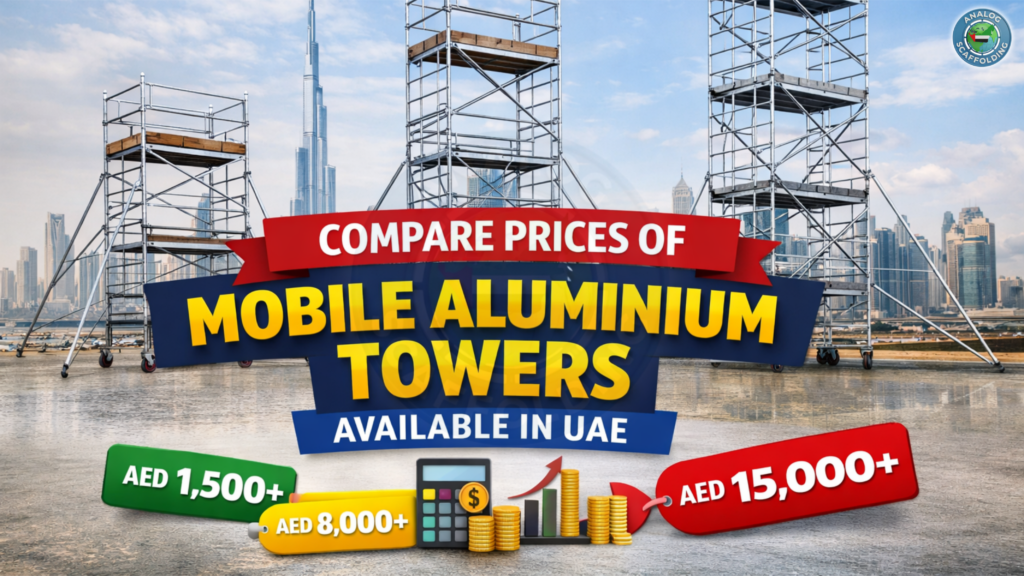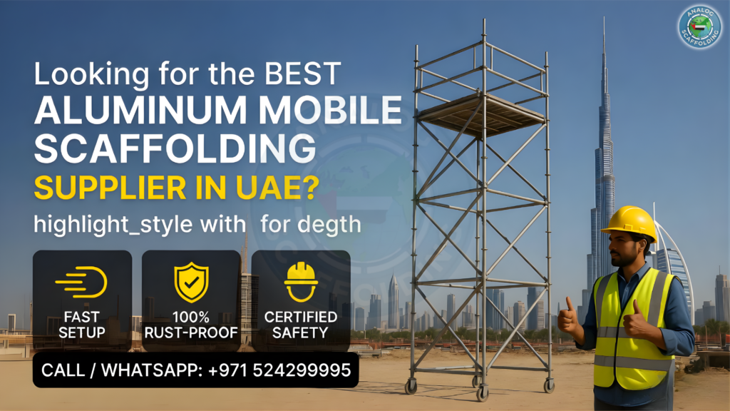 Mobile aluminium scaffolding towers are widely used across UAE construction sites due to their lightweight structure, quick setup, and mobility.